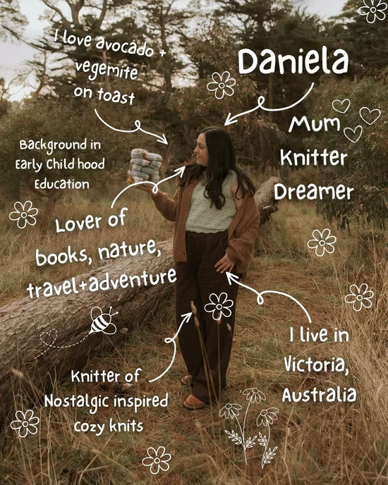 Hello! I'm Daniela, the knitter, dreamer and designer of nostalgic inspired cozy knitwear. I am a mum, a creative soul and a lover of books, nature, photography and adventure.