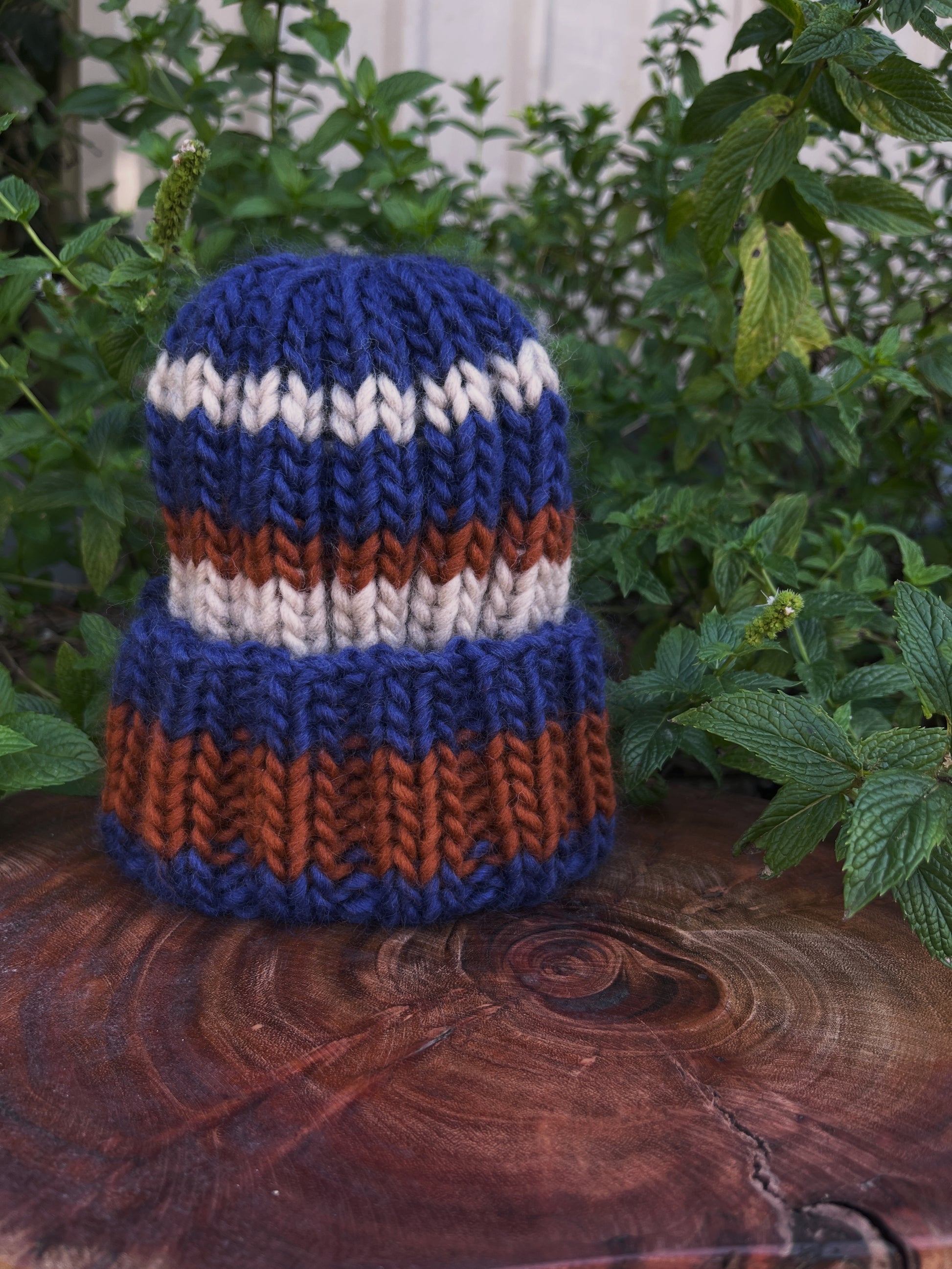 Hand knit pieces are truly one of a kind. Reflecting the nature of handmade, small variations in sizing may occur due to beanie style, knitting tension and the natural stretch of the wool.